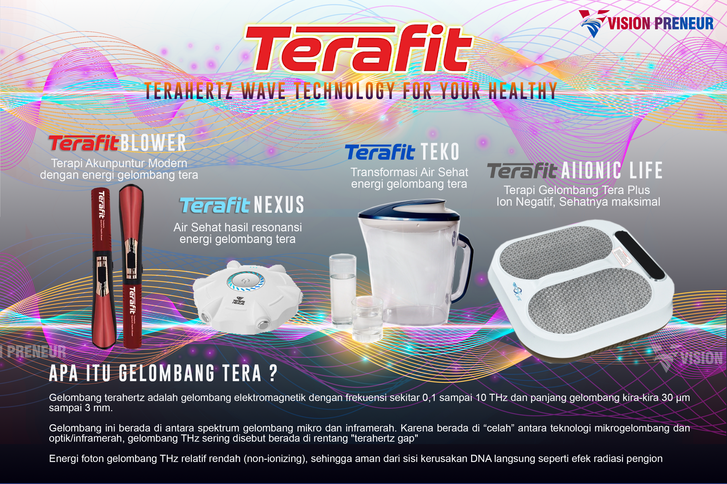 Gelombang terahertz (THz) punya panjang gelombang yang relatif aman (non-ionizing), bisa memengaruhi getaran molekul air, protein, dan biomolekul tertentu. gelombang THz dapat menstimulasi atau meresonansi molekul air. Karena tubuh manusia ±70% air, maka resonansi air bisa membantu sirkulasi, hidrasi, dan aktivitas sel.